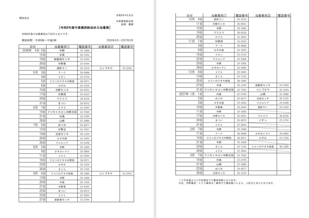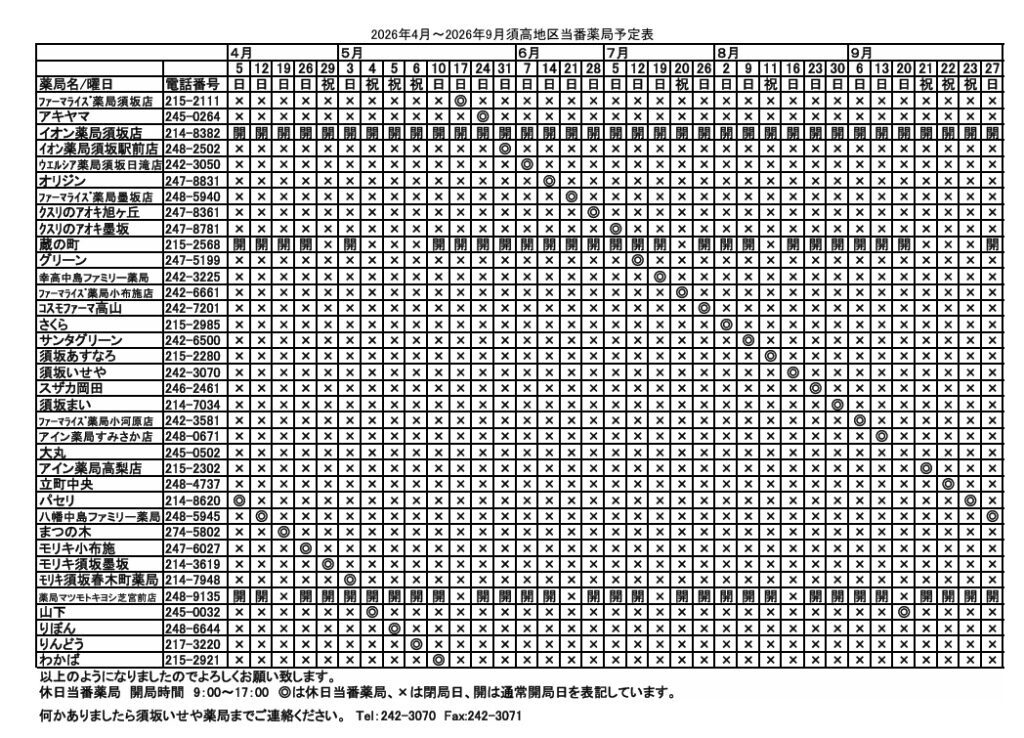 令和8年上半期須高地区休日当番薬局